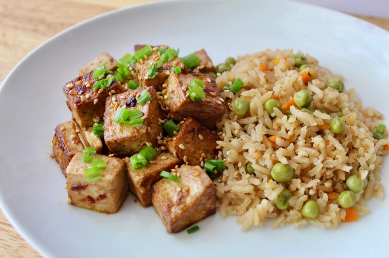 - Once tofu and rice are done you can top it with sesame seeds and minced green onion.